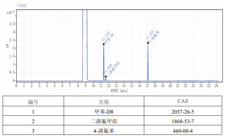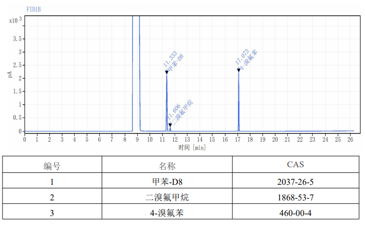 本标准物质以纯度经准确定值的4-溴氟苯(CAS号:460-00-4), 二溴氟甲烷(CAS号: 1868-53-7), 甲苯-D8 (CAS号: 2037-26-5)为原料,色谱级甲醇为溶剂,采用重量-容量法准确配制而成。