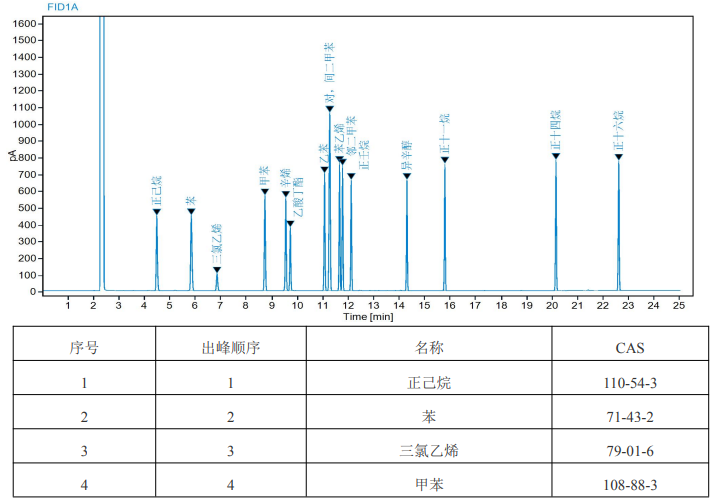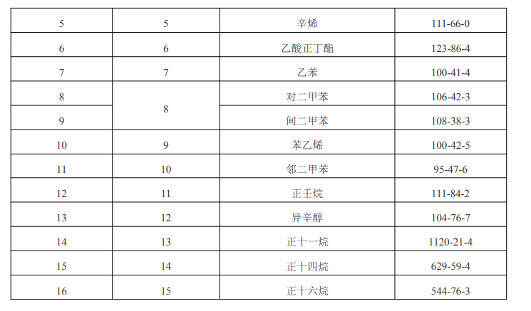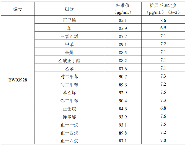 本标准物质以纯度经准确定值的正己烷、苯、三氯乙烯、甲苯、辛烯、乙酸丁酯、乙苯、对二甲苯、间二甲苯、邻二甲苯、苯乙烯、壬烷、异辛醇、正十一烷、正十四烷、正十六烷纯品为原料,以色谱级甲醇为溶剂,采用重量-容量法准确配制而成。