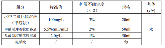 水中二氧化硫溶液:用甲醛吸收液稀释成 1μg/ml 的二氧化硫标准溶液,冷藏保存,稳定一个月。甲醛吸收贮备液:临用时用纯水稀释100 倍配制成甲醛吸收液。盐酸副玫瑰苯胺溶液: 临用前,准确量取 25ml 至100ml 棕色容量瓶中,加入浓磷酸 30ml 和浓盐酸 12ml,再以纯水稀释至刻度 ,摇匀放置24 小时后使用,冷藏避光保存。氨磺酸:5g 称取 0.60g 氨磺酸于 100ml 容量瓶中,加入1.5mol/L氢氧化钠溶液 4.0ml,再以纯水稀释至刻度,摇匀,此溶液密封保存可用10 天。