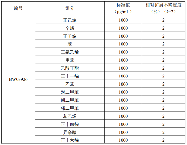 本标准物质以纯度经准确定值的正己烷、苯、三氯乙烯、甲苯、辛烯、乙酸丁酯、乙苯、对二甲苯、间二甲苯、邻二甲苯、苯乙烯、壬烷、异辛醇、正十一烷、正十四烷、正十六烷纯品为原料,以农残级甲醇为溶剂,采用重量法准确配制而成。
