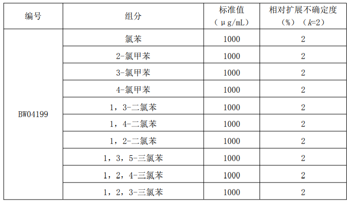 本标准物质以纯度经准确定值的10种氯苯类纯品为原料,无苯级二硫化碳为溶剂,采用重量容量法准确配制而成。