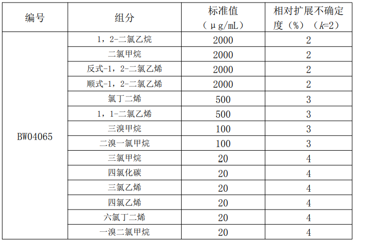 本标准物质以纯度经准确定值的1,2-二氯乙烷、二氯甲烷、反式-1,2-二氯乙烯、顺式-1,2-二氯乙烯、氯丁二烯、1,1-二氯乙烯、三溴甲烷、二溴一氯甲烷、三氯甲烷、四氯化碳、三氯乙烯、四氯乙烯、六氯丁二烯和一溴二氯甲烷纯品为原料,以色谱级甲醇为溶剂,采用重量-容量法准确配制而成。