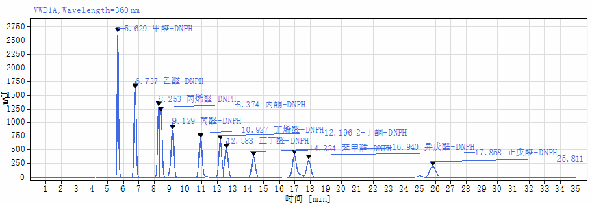 本标准规定了环境空气和固定污染源废气中12种醛酮类化合物的测定方法,包括:甲醛、乙醛、丙烯醛、丙酮、丙醛、丁烯醛、丁醛、苯甲醛、异戊醛、正戊醛、邻甲基苯甲醛、己醛。适用于环境空气采样体积为30L时,各化合物方法检出限范围为0.3~1.0μg/m³。