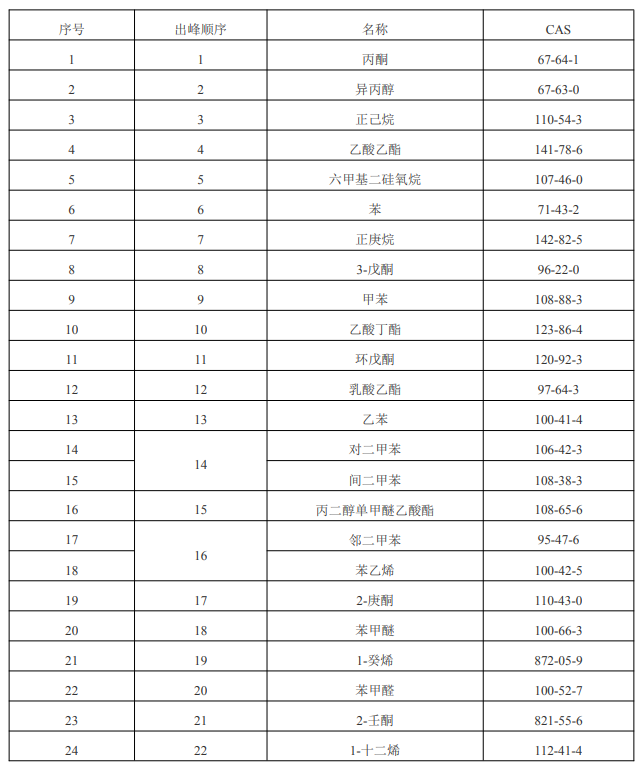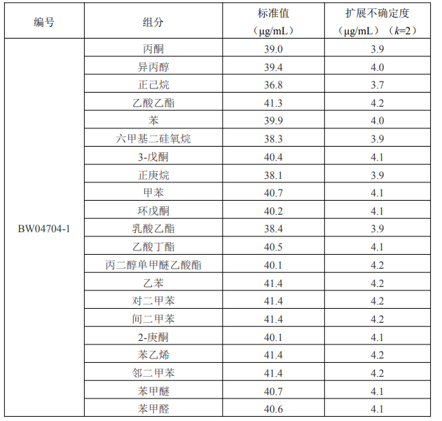 本标准物质以纯度经准确定值的丙酮,异丙醇,正己烷,乙酸乙酯,苯,六甲基二硅氧烷,3-戊酮,正庚烷,甲苯,环戊酮,乙酸丁酯,丙二醇单甲醚乙酸酯,乙苯,对二甲苯,间二甲苯,2-庚酮,苯乙烯,邻二甲苯,苯甲醚,1-癸烯,2-壬酮,1-十二烯,乳酸乙酯,苯甲醛纯品为原料,以色谱级甲醇为溶剂,采用重量-容量法准确配制而成。