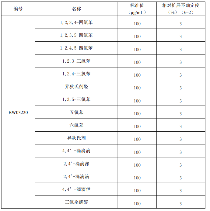 本标准物质以纯度经准确定值的34种有机氯/氯苯为原料,以色谱级丙酮为溶剂,采用重量-容量法准确配制而成。
