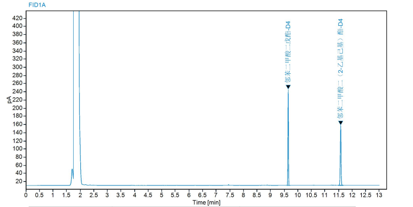 本标准物质以纯度经准确定值的邻苯二甲酸二(2-乙基己基)酯-D4(C24D4H34O4,CAS:93951-87-2)、邻苯二甲酸二戊酯-D4(C18D4H22O4,CAS:358730-89-9)为原料,以色谱级乙酸乙酯为溶剂,采用重量-容量法准确配制而成。