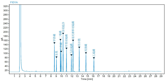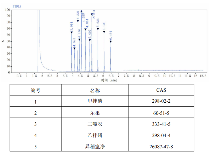 本标准物质以纯度经准确定值的甲拌磷(CAS 号:298-02-2),乐果(CAS号:60-51-5),二嗪农(CAS 号:333-41-5),乙拌磷(CAS 号:298-04-4),异稻瘟净(CAS 号:26087-47-8),甲基对硫磷(CAS 号:298-00-0),马拉硫磷(CAS 号:121-75-5),毒死蜱(CAS 号:2921-88-2),对硫磷(CAS 号:56-38-2),稻丰散(CAS 号:2597-03-7),丙溴磷(CAS 号:41198-08-7),乙硫磷(CAS 号:563-12-2)为原料,以色谱级正己烷为溶剂,采用重量-容量法准确配制而成。
