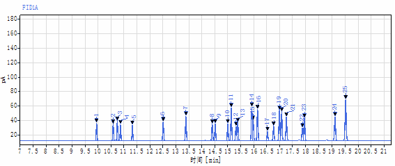 柱箱:60℃→40℃/min→130℃(1min)→12℃/min→180℃(1min)→7℃/min→240℃→5℃/min→260℃(3min)