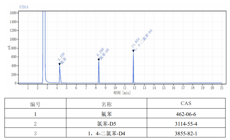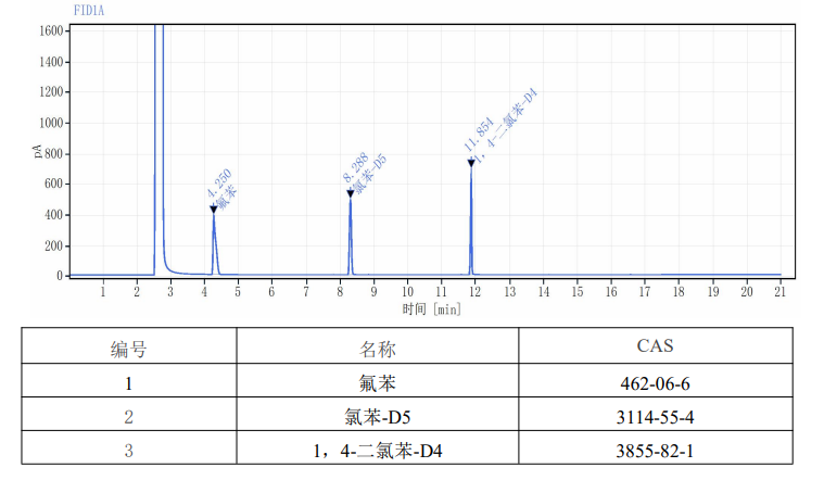 本标准物质以纯度经准确定值的氟苯(CAS号:462-06-6),1,4-二氯苯-D4 (CAS号:3855-82-1) ,氯苯-D5 (CAS号:3114-55-4)为原料,农残级甲醇为溶剂采用重量容量法准确配制而成。