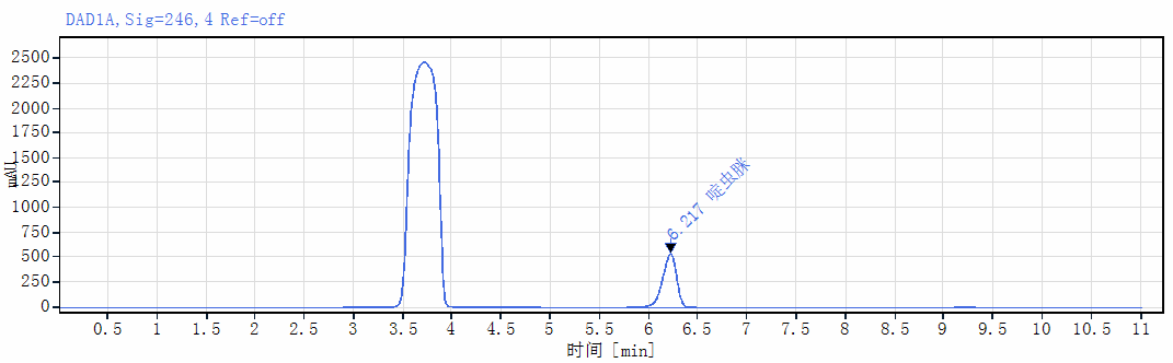 依据JJF1343技术规范(等效ISO35指南),随机抽取分装后的样品采用液相色谱法对溶液均匀性检验、稳定性考察。检验结果表明均匀性、稳定性良好。