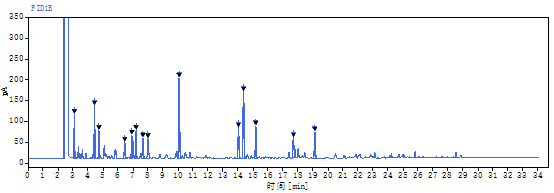 柱箱:38℃(1min),3.8℃/min→80℃(1min),10℃/min→105℃(5min),10℃/min→150℃(1min),10℃/min→180℃(5min)