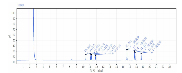 柱箱:60℃→40℃/min→130℃(1min)→12℃/min→180℃(1min)→7℃/min→240℃→5℃/min→260℃(3min)