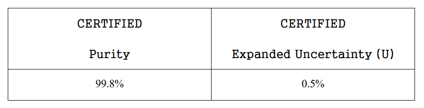 It is recommended to use 1 mg as the minimum sample size and if less material is used, to increase the certified uncertainty by a factor of two for half sample and four for a quarter of sample. If storage after opening is necessary, the RM should be tightly closed and kept from light and moisture. If the RM was in a sealed ampoule, it should be transferred to a vial with minimum head space.