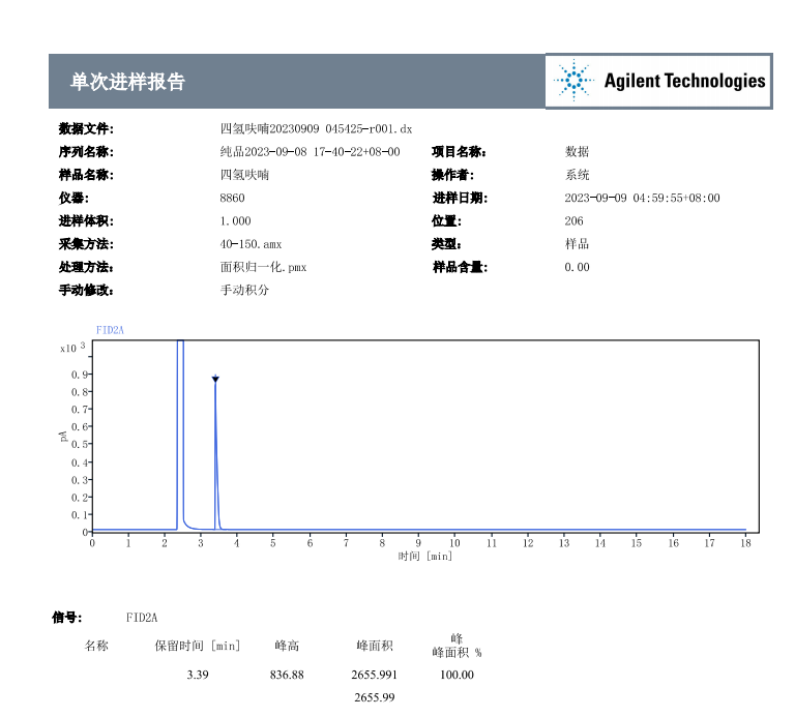 3. 色谱条件:毛细管柱(HP-5),柱温80℃(3分钟)-20℃/min升温至200℃;