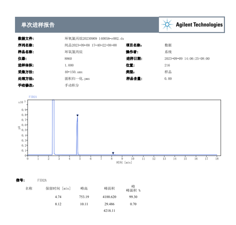 1. 气相色谱法(GC):用于测定主含量及杂质,色谱柱为毛细管柱,检测器为氢火焰离子化检测器(FID)。