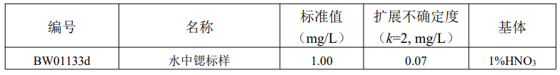 本标准样品应按以下程序稀释后方可使用:用洁净干燥的移液管从安瓿瓶中准确移取10.0mL转移至250mL容量瓶中,用1%硝酸稀释定容至刻度,混匀后立即使用。稀释后的标准值和扩展不确定度为: