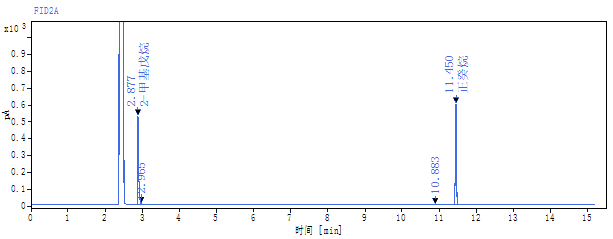 本标准物质采用纯度准确定值的2-甲基戊烷,正癸烷为原料,以色谱级甲醇为溶剂,采用重量容量法准确配制而成。