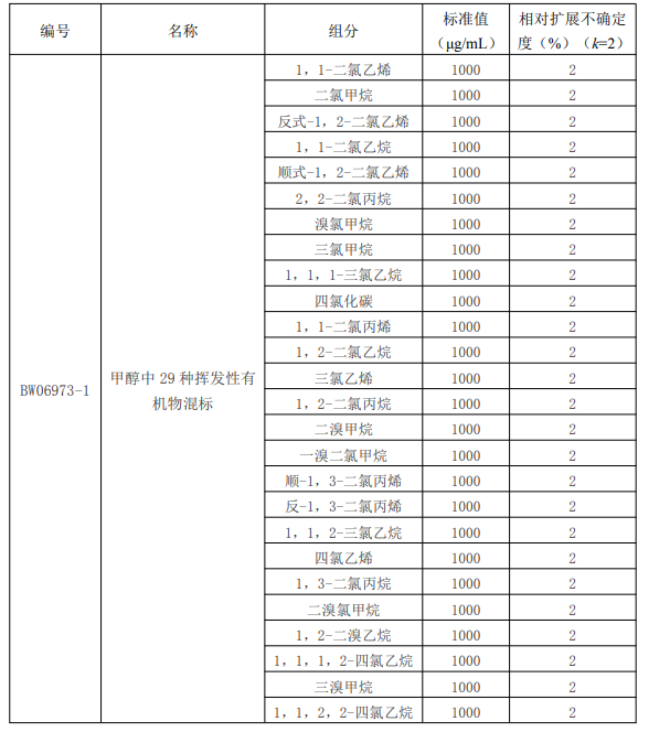 本标准物质以纯度经准确定值的 35 种挥发性有机物纯品为原料,以色谱级甲醇为溶剂,采用重量容量法准确配制而成。