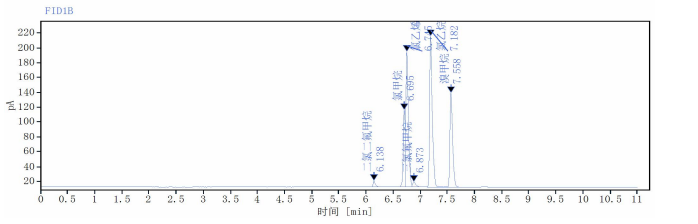 检测器:GC-MSD 扫描方式:SCAN 溶剂延迟:0.5min色谱柱:DB-624(30m×0.25mm×1.4μm)流 量:1.5mL/min分流比:100:1进样口:220℃柱 箱:38℃(1.8min),10.0℃/min→120℃,15.0℃/min→210℃载气:氦气 离子源温度:230℃ 扫描范围:m/z 35-270amu离子源:EI 源 离子化能量:70Ev