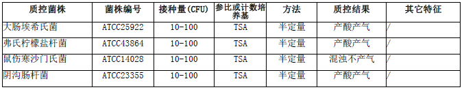 按标签用法制备培养基,接种以下质控菌株,放置36±1℃需氧培养24±2小时。