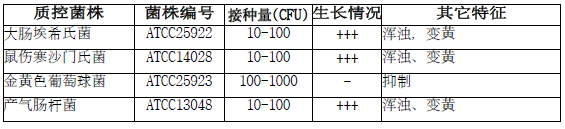 按标签用法制备培养基,接种以下质控菌株,放置36±1℃需氧培养18-24小时。