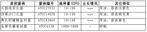 按标签用法制备培养基,接种以下质控菌株,放置36±1℃需氧培养18-24小时。