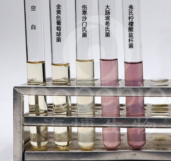 大肠埃希氏菌浑浊生长,溶液显淡紫色,伤寒沙门氏菌浑浊生长,溶液稍变黄。