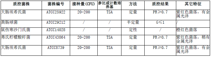 按标签用法制备培养基,接种以下质控菌株,放置36±1℃需氧培养24±2小时。