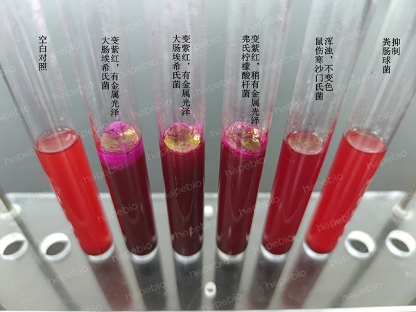 胰胨、蛋白胨可提供氮源和生长因子;酵母浸粉提供微生物需要的微量元素;乳糖为大肠菌群可发酵的糖;氯化钠稳定渗透压;磷酸氢二钾与磷酸二氢钾为培养基pH缓冲剂;硫酸十二烷基钠和去氧胆酸钠可抑制大部分革兰氏阳性菌;加入无水乙醇可以提高培养基的抑菌性;亚硫酸钠可以使碱性品红还原脱色;碱性品红为指示剂。发酵乳糖的细菌产生乙醛和酸,乙醛与亚硫酸钠和品红化合物结合变为紫红色,快速发酵乳糖的细菌使碱性品红结晶析出产生金属光泽。