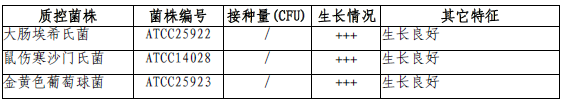 按标签用法制备培养基,接种以下质控菌株,放置36±1℃需氧培养18-24小时。