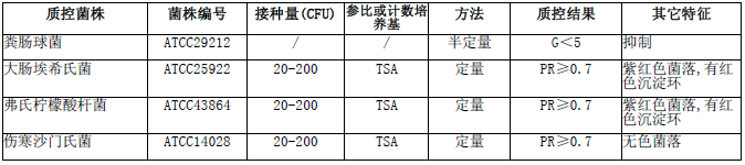 按标签用法制备培养基,接种以下质控菌株,放置36±1℃需氧培养18-24小时。