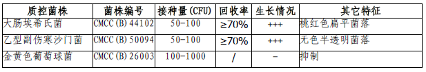 按标签用法制备培养基,接种以下质控菌株,放置30-35℃需氧培养18-72小时。 注:回收率计算时,用TSA琼脂做对照培养基。