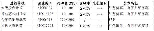 按标签用法制备培养基,接种以下质控菌株,放置36±1℃需氧培养24±2小时。