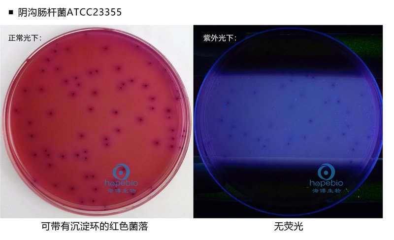 VRBA-MUG平板计数法的原理是,超过96%的大肠埃希氏菌菌株(包括不产气菌株)都能产生β-葡萄糖苷酸酶,MUG被该酶分解后游离出4-甲基伞形酮,在366nm紫外光下,游离的4-甲基伞形酮发出带蓝色的荧光,而与β-葡萄糖苷结合状态的4-甲基伞形酮不显荧光,观察到带蓝色荧光即认为是大肠埃希氏菌阳性。肠杆菌科中β-葡萄糖苷酸酶阳性的细菌除了大肠埃希氏菌之外,还有某些志贺氏菌、沙门氏菌和耶尔森氏菌,但考虑到这些菌都是致病菌,所以这种假阳性在公共卫生学上不认为是缺陷。而且,经Moberg对1400多份样品进行检验,未发现1次这种假阳性,说明这种假阳性的发生极为少见。