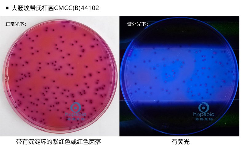 蛋白胨和酵母膏粉提供碳氮源和微量元素;乳糖是可发酵的糖类;氯化钠可维持均衡的渗透压;3 号胆盐抑制革兰氏阳性菌,特别抑制革兰氏阳性杆菌和粪链球菌;结晶紫对革兰氏阳性菌如葡萄球菌、 白喉杆菌,以及绿脓杆菌、白念珠菌、表皮癣菌有杀灭作用,对其他革兰氏阴性菌和抗酸菌几乎无作用;中性红为pH 指示剂;琼脂为凝固剂;大肠埃希氏杆菌含有的葡萄糖醛酸苷酶作用于4-甲基伞形酮-β-D 葡萄糖醛酸苷(4-Methylumbellifery-β-D-Glucuronide 简称MUG)的β糖醛酸苷键,使其水解,释放的4-甲基伞形酮在366nm 紫外灯下产生蓝白色荧光。97%的大肠埃希氏杆菌、10%的沙门氏菌以及少量的志贺氏菌具有葡萄糖醛酸苷酶。