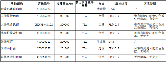 按标签用法制备培养基,接种以下质控菌株,放置36±1℃需氧培养18-24小时。