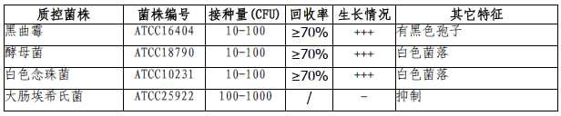 按标签用法制备培养基,接种以下质控菌株,放置28±1℃需氧培养48-72小时。