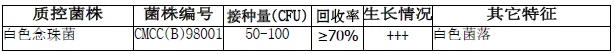 按标签用法制备培养基,接种以下质控菌株,放置23-28℃需氧培养24-48小时。注:回收率计算时,用SDA琼脂做对照培养基。