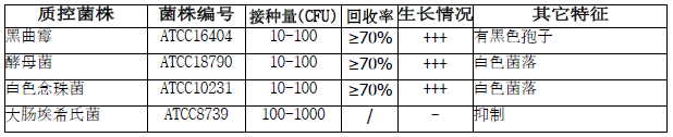 按标签用法制备培养基,接种以下质控菌株,放置30±1℃需氧培养48-72小时。注:回收率计算时,用PDA 琼脂做对照培养基。