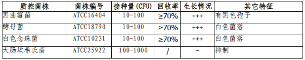 按标签用法制备培养基,接种以下质控菌株,放置20-25℃需氧培养48-72小时。注:回收率计算时,用SDA琼脂做对照培养基。
