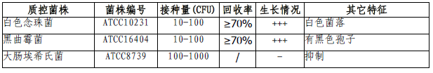 按标签用法制备培养基,接种以下质控菌株,放置20-25℃需氧培养48-72小时。注:回收率计算时,用SDA琼脂做对照培养基。
