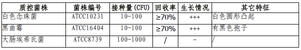 按标签用法制备培养基,接种以下质控菌株,放置20-25℃需氧培养48-72小时。注:回收率计算时,用SDA琼脂做对照培养基。