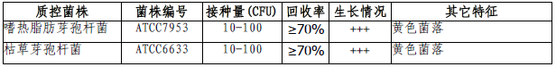 DTA培养基微生物灵敏度试验:按标签用法制备培养基,接种以下质控菌株,放置55℃需氧培养48小时。 注:回收率计算时,用TSA琼脂做对照培养基。