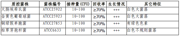 按标签用法制备培养基,接种以下质控菌株,放置36±1℃需氧培养18-24小时。 注:回收率计算时,用TSA琼脂做对照培养基。