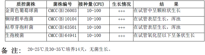 在37℃培养5天,接种10-100个大肠杆菌、金黄色葡萄球菌、链球菌和产气荚膜梭菌应生长明显。