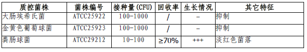 按标签用法制备培养基,接种以下质控菌株,放置36±1℃需氧培养24-48小时。 注:回收率计算时,用TSA琼脂做对照培养基。