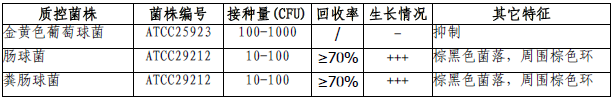 按标签用法制备培养基,接种以下质控菌株,放置36±1℃需氧培养24-48小时。注:回收率计算时,用TSA琼脂做对照培养基。