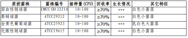 按标签用法制备培养基,接种以下质控菌株,放置36±1℃需氧培养24-48小时。注:回收率计算时,用TSA琼脂做对照培养基。