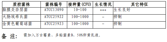 称取本品 30.0g,加热溶解于 1000ml 蒸馏水中,分装,每瓶 200ml,121℃高压灭菌 15 分钟,至 45-50℃时,每瓶加入 1 支过滤除菌的万古霉素(0.66mg)、1 支过滤除菌的多粘菌素 B(5000IU)和 50% 卵黄乳液16ml,混匀, 备用。