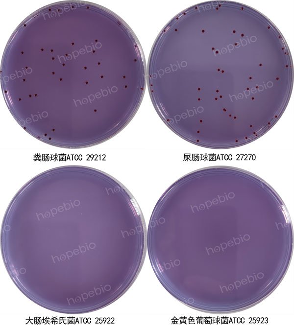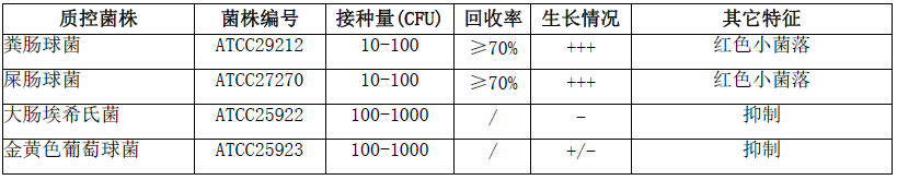 屎肠球菌选择性培养基微生物灵敏度试验:按标签用法制备培养基,接种以下质控菌株,放置36±1℃需氧培养24-48小时。注:回收率计算时,用TSA琼脂做对照培养基。